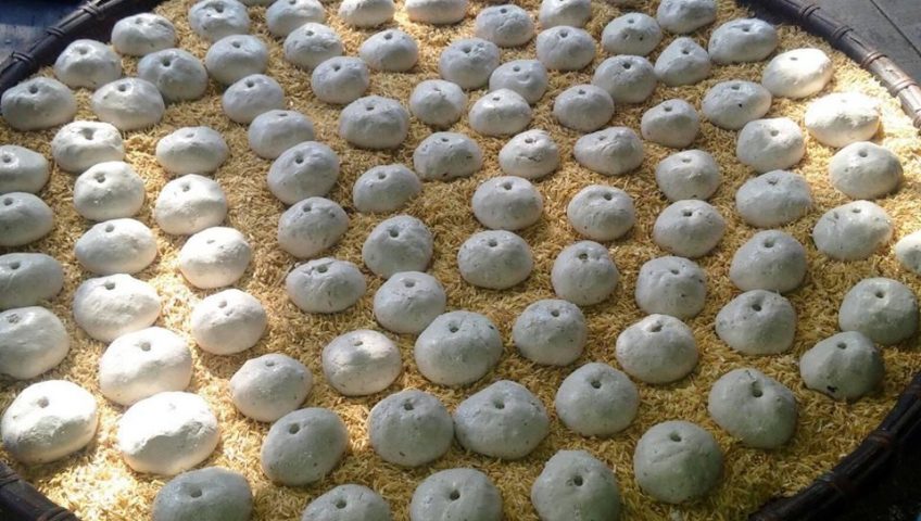 - Khi nấu xong cơm, bạn xới cơm ra khay để nguội. Trong quá trình chờ cơm nguội, bạn tiến hành giã những viên men thành bột mịn và loại bỏ trấu
